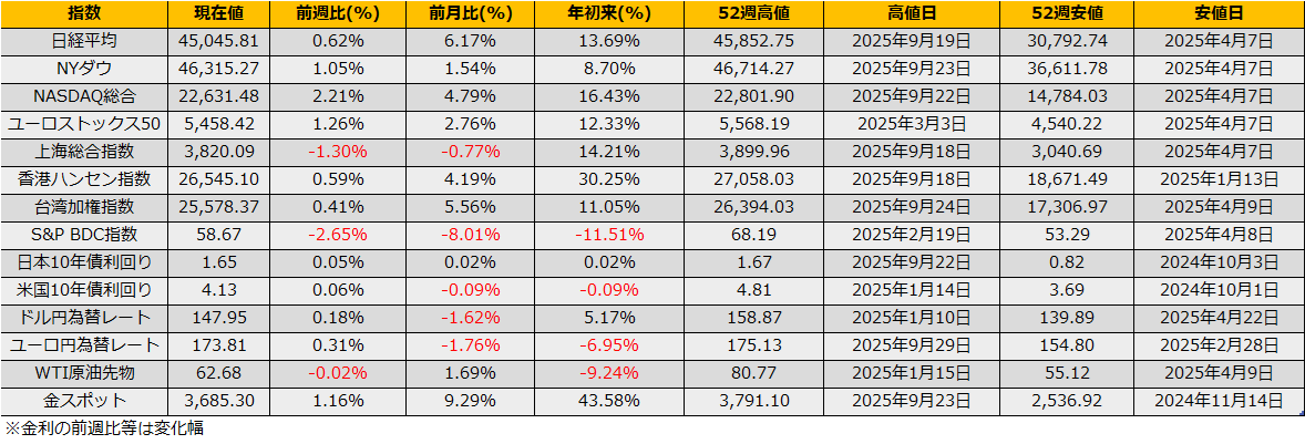 9月第3週の株式市場は、日経平均は+0.62%、NYダウ+1.05%、ユーロストックス50指数は+1.26%といずれも続伸となりました。